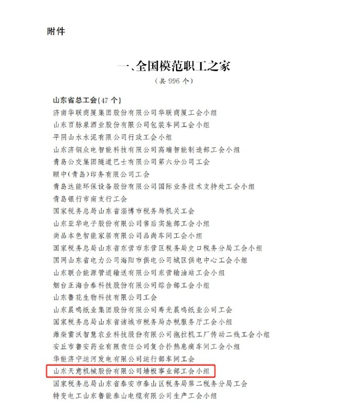 近日,中華全國總工會下發(fā)了《關(guān)于表彰全國模范職工之家全國模范職工小家全國優(yōu)秀工會工作者的決定》,天意機(jī)械墻板事業(yè)部工會小組獲評“全國模范職工小家榮譽稱號”。