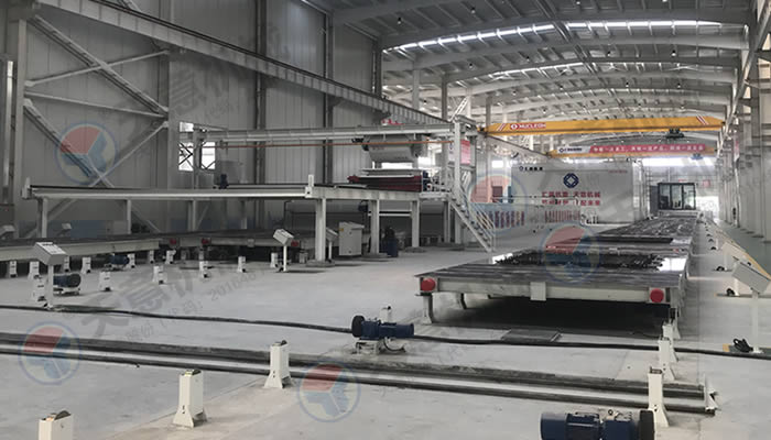 產(chǎn)品展示PC環(huán)形疊合板生產(chǎn)線采用高精度、高結構強度的成型模具,經(jīng)自動布料機把混凝土澆筑其中、振動臺振搗后并不立即脫模,而是經(jīng)預養(yǎng)護、蒸汽養(yǎng)護,使構件強度滿足設計強度時才進行拆模處理,拆模后的成品構件運輸至成品暫存區(qū)或室外堆場,而空模臺沿輸送線自動返回,形成自動化環(huán)形流水作業(yè)。