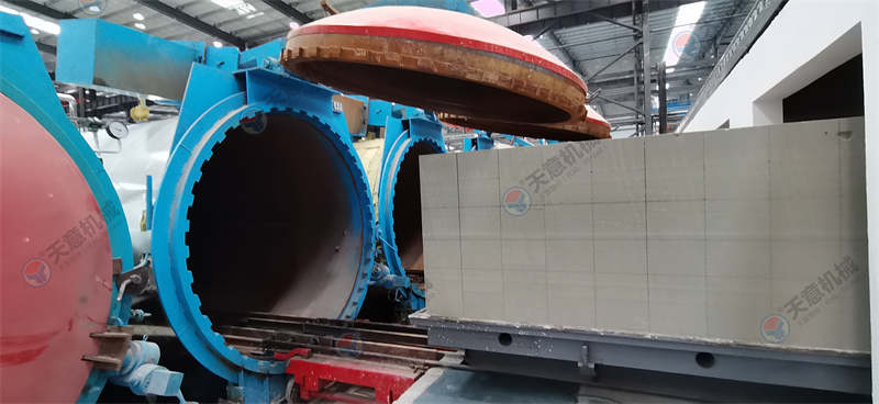 蒸壓養(yǎng)護(hù)是對加氣混凝土坯體進(jìn)行高壓蒸汽養(yǎng)護(hù),對加氣混凝土而言,只有經(jīng)過一定的溫度和足夠時間的養(yǎng)護(hù),坯體才能完成必要的物理化學(xué)變化,從而達(dá)到滿足建筑施工的強度需要。 蒸壓養(yǎng)護(hù)工序決定了加氣混凝土內(nèi)在性能的最后形成。 裝入蒸養(yǎng)釜: 養(yǎng)護(hù)車上坯體被運至蒸養(yǎng)釜, 在釜中受到高壓蒸汽的養(yǎng)護(hù)