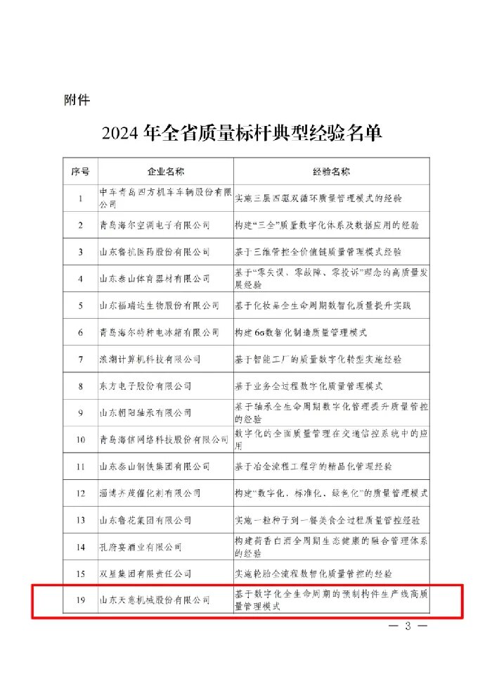 7月,山東省工業(yè)和信息化廳公布了全省質(zhì)量標(biāo)桿獎(jiǎng)。天意機(jī)械憑借在關(guān)鍵過(guò)程質(zhì)量控制方向的不懈探索,以基于數(shù)字化全生命周期的預(yù)制構(gòu)件生產(chǎn)線(xiàn)高質(zhì)量管理模式斬獲“2024年全省質(zhì)量標(biāo)桿”。