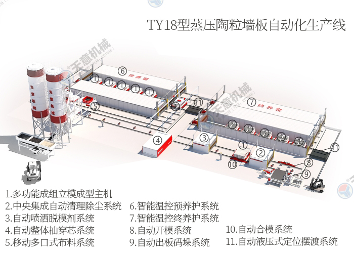 近年來,混凝土空心墻板發(fā)展迅速,究其原因是其原材料水泥和粗細(xì)骨料易于購買,生產(chǎn)效率高能夠?qū)崿F(xiàn)半機(jī)械化或者機(jī)械化生產(chǎn)等因素。其中陶?;炷翍?yīng)用于輕質(zhì)隔墻板中,能夠進(jìn)一步提高輕質(zhì)隔墻板的性能,因此在天意機(jī)械的客戶中生產(chǎn)陶粒墻板的客戶也是越來越多,下面主要為大家介紹一下陶?;炷翂Π宓呐浞奖壤皦Π鍣C(jī)生產(chǎn)工藝。